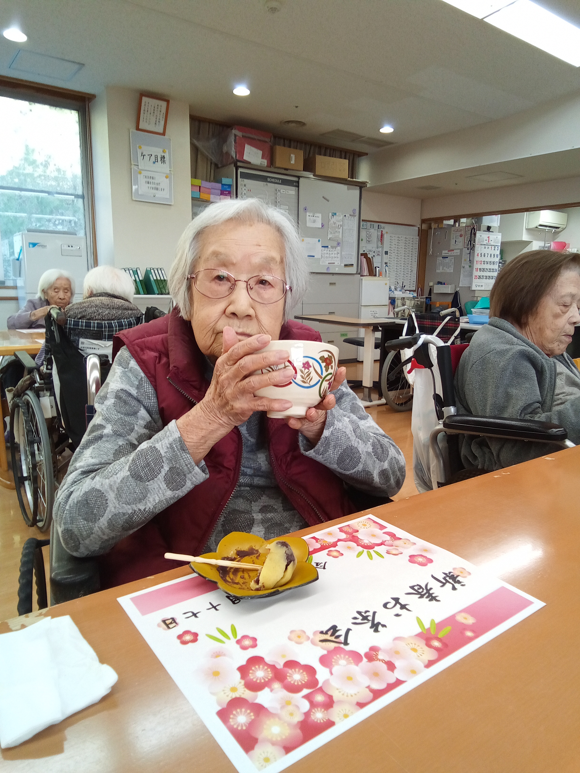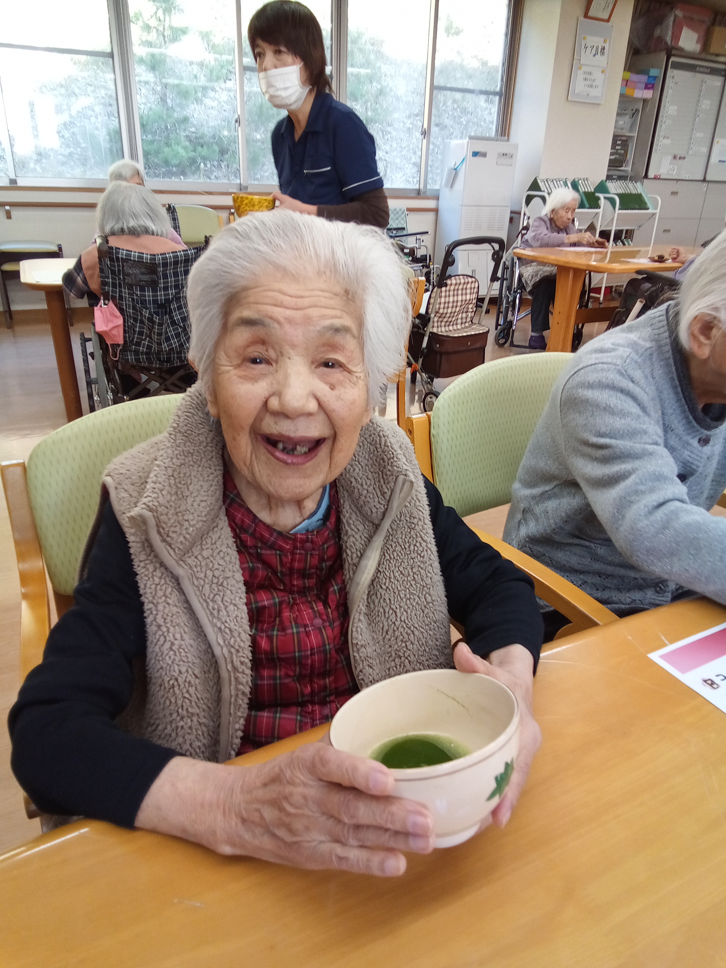 1月誕生会(新春お茶会) 2026/01/17 R8.1.17 本日吉祥では、1月の誕生会として「新春お茶会」を行いました。 裏千家茶道の貞中宗美先生がお点前を披露してくださいました。 皆様、先生が点ててくださったお抹茶をおいしそうにいただいておられました。